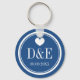 Personalized monogram wedding party favour keychain. Monogrammed keychains with name initials of bride and groom plus date of marriage. Cute heart love symbol and custom background colour ie nautical navy blue and white. Make your own pretty key chain for guests, bride to be, groom, bridesmaids, etc Also nice for classy bridal shower, engagement, save the date or anniversary.