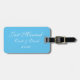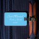 Custom luggage tag is shown in a tropical blue colour with Just Married text. Customize this tag and change names and date to yours, also put your photo on the back of tag. You can even change colours.