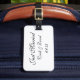Custom luggage tag is shown in a black and white style with Just Married text.