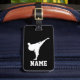 Custom luggage tag with martial arts karate kick. Personalized Birthday gift idea for kids (boy or girl), teacher, instructor, sports coach, friend, son, grandson, daughter, black belt, etc. Add your own name, monogram or funny quote. Cool travel accessories for him or her. Strap these labels onto your bags and suitcases. Also great for other fight sports like ju jitsu, taekwondo, judo, aikido, kickboxing, jiu jitsu, muay thai etc.