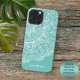 Contemporary white Mandala rosette pattern on a light teal blue green coloured background. With room to customize or personalize with a name, monogram initial, or zen word of your choice. Beautiful, modern, and cool cover for the trend-savvy and art-loving hip trendsetter, artsy motif lover who wants to protect their phone from dust and dirt, wear and tear. This design is available in Apple iPhone 6, 7 and 8 Plus, 10 or X, XR, XS, 11, 12, 13 Mini, 14, 15 Plus, and Pro Max cellphone cases. Show off your style, look fashionable trendy, and feel stylish with a unique design on a mobile device accessory of your choice.