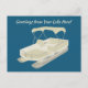Spending your vacation lounging aboard your pontoon boat? Send your own personalized pontoon boat postcards to family and friends. These postcards feature an illustration of a pontoon boat in shades of tan and cream against a marine blue background with your own greeting at the top in script lettering. The blank back's ready for your own handwritten message or a custom printed message or illustration.