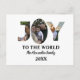 Custom modern 3 photo collage joy to the world. Personalize with your photos, family name and year