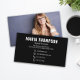This design features a modern custom black and white business card with a simple bold minimal template, minimalist contact information info, with phone email mobile cell text, as well as contact icons website web address, full bleed photo back side, professional business corporate, freelancer independent small business, simple basic plain clean lines, with bold block style lettering