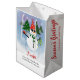 Wrap your gifts in seasonal style with this gift bag featuring the snowman surrounded by decorated pine trees and falling snowflakes. His red Santa hat, green scarf, and gold-starred ornament add festive flair. The editable text “Season’s Greetings And A Happy New Year” appears prominently, making this bag both decorative and personal.