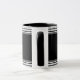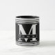 A Modern Custom mom Personalized Monogram Black & White Coffee Mug. Completely Customize and personalize the monogram and word on cup. Black background and white lettering with white horizontal stripes on the top and bottom