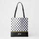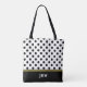 This black-and-white tote bag has a black polka dot pattern. At the bottom of the bag, there is a black band that you can use to customize the bag with your initials/text. The faux gold lines above the monogram are an artistic rendering (no gold foil on bag).