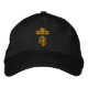 A custom monogram hat, A black hat with a non-metallic gold stitched design of a crown monogram.