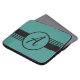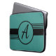 Laptop case with a blue background, black stripes, and a custom monogram