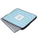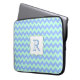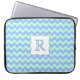 Stylish 15" laptop case done in a mint green and blue zigzag chevron pattern. Graphics of a mint green framed decorative white text plaque, in the centre of the case, has a one letter blue monogram. Personalize the letter for yourself or as a great gift idea.