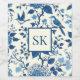 a custom monogrammed wine label that exudes sophistication and personal flair. The label is graced with an ornate blue and white pattern reminiscent of vintage porcelain, detailed with an array of stylized flowers and serene birds. The design invokes the elegance of a bygone era, perfect for adorning a bottle of fine wine.