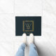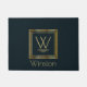 Monogram and name in faux gold - golden yellow coloured minimalist font set on a golden flourish and framed in an intricate golden geometric frame. Set on solid black pearl - a deep dark rich blue. Use the template to personalize with your monogram initial.