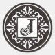 Decorative Initial Monogram Stickers with a white swirls pattern on a black background framing your elegant monogram .