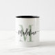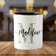 Elegant, modern coffee mug with your custom name and monogram in a trendy hand lettered script calligraphy design in minimalist dusty sage green and black, this typography driven design makes a great gift for coworkers, teachers, coaches, girlfriends, boyfriends, wives, daughters, or any other work or family member! Great for the office or home decor this chic mug makes a fun, stylish present for any birthday or appreciation thank you!