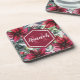 Custom rustic red poinsettia coaster. - Whimsical watercolor red poinsettias, holly leaves, and winter berries on a white wood background. The winter floral background is topped with a berry red label and custom monogram / script calligraphy name template. A traditional, whimsical poinsettia gift with a personal touch.