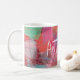 Cool girly pretty trendy mug with abstract design pattern inspired from my unique contemporary textile embroidery .Colourful, vibrant vivid bright bold colour scheme, nuances of red, pink, green, blue, grey. Feminine, for you or as a creative original thoughtful and useful gift for her.It can be personalize customize with a name for example or only with initial letters,,monogrammed or even delete the text if you don’t need it. Attractive, surely noticeable and admired gift idea for various occasions or celebrations, Valentine’s Day holiday, Christmas holiday, birthdays, anniversary.