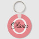 Custom monogrammed coral pink keychain gift. Personalized round button key chain with name initial letter. Elegant script typography template.