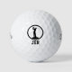 Eye-catching golf ball design for him features a male golfer silhouette in black outlined by a circular frame also in black. Bold style initials complete the design template. Colours of this design may be changed. Other colours available.