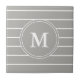 A large white monogram is inside of a grey circle in the centre. The background is grey and white stripes.
