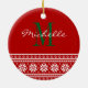 Custom monogrammed round Christmas tree ornament for friends, family, co worker, school teacher, employees, engaged couple, newlyweds, husband and wife, bride and groom etc. Elegant script typography template for name monogram. Cute personalized winter Holiday decoration gift idea for him and her. Classy red and green double sided xmas accessories with Nordic "ugly christmas sweater" snowflake pattern. Add names on both sides. Change quantity to get the cheap bulk price. Includes sparkly gold string.