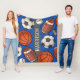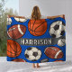 Perfect for athletes of all ages and families for sporting events. Stay warm at chilly football, soccer, hockey and basketball sports games and cuddle up on the couch with this custom monogrammed multi sport patterned fleece blanket. Includes a cool and unique illustrated border pattern of sports balls and hockey pucks along with modern custom all caps outlined text that can be personalized with first or last name. Includes a royal blue background colour.