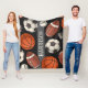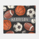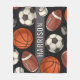 Perfect for athletes of all ages and families for sporting events. Stay warm at chilly football, soccer, hockey and basketball sports games and cuddle up on the couch with this custom monogrammed multi sport patterned fleece blanket. Includes a cool and unique illustrated border pattern of sports balls and hockey pucks along with modern custom all caps outlined text that can be personalized with first or last name. Includes a soft black background colour.