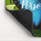 Custom mouse pad with tropical blue Morpho butterfly photo background. Classy brush script typography and exotic background image. Elegant mousepad gift. Monogrammed with your name initial letters or surname. Cute Holiday or Birthday gift idea for friends, family, mom, mother, grandma, wife, daughter, girl, sister etc. Custom computer accessories with beautiful close up macro nature photography.