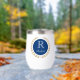 Custom name thermal wine tumbler is shown with a winner's gold wreath print with a sample initial and name.