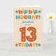 A bright and cheerful birthday card for you to personalize on the front cover, with colorful lettering on a cream background. The front cover greeting is, 'hip hip HOORAY! (Space for you to add the name), you're 13 years old TODAY!' in a bold, colorful script. The red number 13 is extra-large and has big dots in golden yellow and a greenish blue. The inside message is just a suggestion and you can easily change it or delete it if you prefer something different or no printed inside message at all.