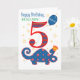 A fun 5th birthday card to customize, with a cute dinosaur, wearing a party hat and with a balloon tied to its tail. The dinosaur (diplodocus) has pink, yellow and orange polka dots and the number 5 is filled with brightly colored stripes. The front cover greeting, in blue to match the dinosaur, is, 'Happy Birthday' with space for you to add the name of the child's birthday. The balloon is also blue and has the word, 'TODAY!' written on it in white and there are little yellow stars all over the white background. The inside message is just a suggestion and you can easily personalize it if you wish.