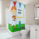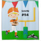 Boys football theme shower curtain for the boy who loves and plays football, features a boy football player in an orange uniform and helmet, goal post, flags, and an area you can personalize with his name and number!