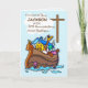 A sweet anniversary card for a Baptism. On a blue background, Noah's ark holds animals as they look toward the cross. Wish a happy and blessed Baptismal anniversary to a boy. You can personalize this card with the year and the name of that special boy.