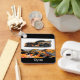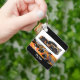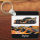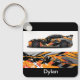 This keychain is shown in a black colour with a auto race car print design with a custom sample name.
