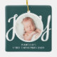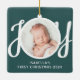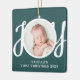 This cute Baby's First Christmas Photo Ornament is decorated with the word JOY in stylish script typography on a green background.