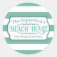 This sticker features a nautical theme with teal horizontal stripes in the background. A vintage style frame is in the centre with a sample family name and the Beach House title printed in a whimsical teal or aquamarine font. The location of the beach house is printed at the bottom. You can personalize the sticker to include your own custom name or text.