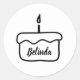 Stickers with a design featuring a line drawing of a birthday cake with a birthday candle. The cake has a layer of frosting and the base cake where the name of the birthday boy/girl is featured, in a script font.