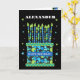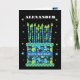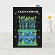 A bright birthday card for you to customize, with lots of patterned candles on a birthday cake. At the top of the front cover, there is plenty of space for you to write the name of the recipient in white lettering on the black background. There is a blue band around the cake with 'HAPPY BIRTHDAY!' also in white. Tiny blue, green and white stars are scattered around the black background and the inside verse is just a suggestion, which you can easily change or delete if you wish.