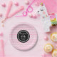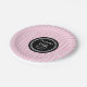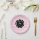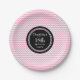 Customizable name and birthday year party plates in fun and chic baby pink, black and white retro chevron zigzag stripes pattern.