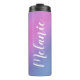 Name typography colourful gradient thermal coffee tumbler - Stylish brushed metal graphic with pink and purple ombre gradient colours. Personalise the custom calligraphy script name template with your first name. A stylish gift for her birthday, bridesmaid proposal box, mother's day, bachelorette party, etc.