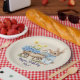 Introducing our Custom Name Bunny with Blue Flowers Birthday Party paper plate! With a little rabbit holding blue wildflowers, a wooden cart with many blue wildflowers and a little house in the back, this paper plate brings charm and playfulness to any celebration!