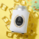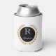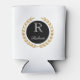 Custom name can cooler is shown with a winner's gold wreath print with a sample initial and name.