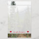 This stationery design features a photo of a forest scene with coniferous trees, along with a mountain in the background. It also features a customized name near the bottom, between heart shapes. [~Z0000011]