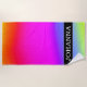 This beach towel design features a fun, rainbow-like multicolored gradient pattern featuring various shades of colours like yellow, orange, red, pink, purple, blue and green. It also features a personalized name in white coloured text within a dark coloured area on the front. [~Z0000000]