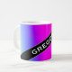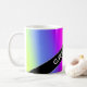 This mug design features a fun, rainbow-like multicolored gradient pattern featuring various shades of colours like yellow, orange, red, pink, purple, blue and green. It also features a personalized name in white coloured text within a dark coloured area, with both at an angle. [~Z0000051]