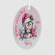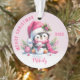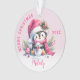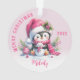 Create a personalized girly pink ornament with a cute penguin in a pink Santa hat and scarf sitting with a snowman and surrounded with ornaments and holiday greenery. The template text makes it easy to customize with your name and year. The name is in a script calligraphy font, adding elegance to this keepsake for girls who love penguins and pink colours.