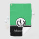 This golf towel is shown as is in a two-tone colour of black and green with a white accent stripe and shows an art print of a golfer.