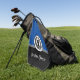 This golf towel is shown as is in a two-tone colour of black and royal blue with a white accent stripe and shows an art print of a golfer.