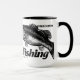 Let's go fishing old-style illustration mug with a big trout and a fish angler on a boat. Personalize it with a name for an ideal gift for a man who loves outdoor sports.