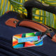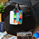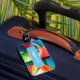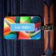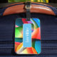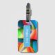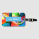 Custom name luggage tag is shown in a multi colour abstract art print and a sample name shown, customize and change the sample text to yours.