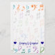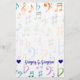This stationery design features a pattern involving various music notes and music notation symbols coloured a variety of colours. It also features a customized name near the bottom, between two heart shapes. [~Z0000113]